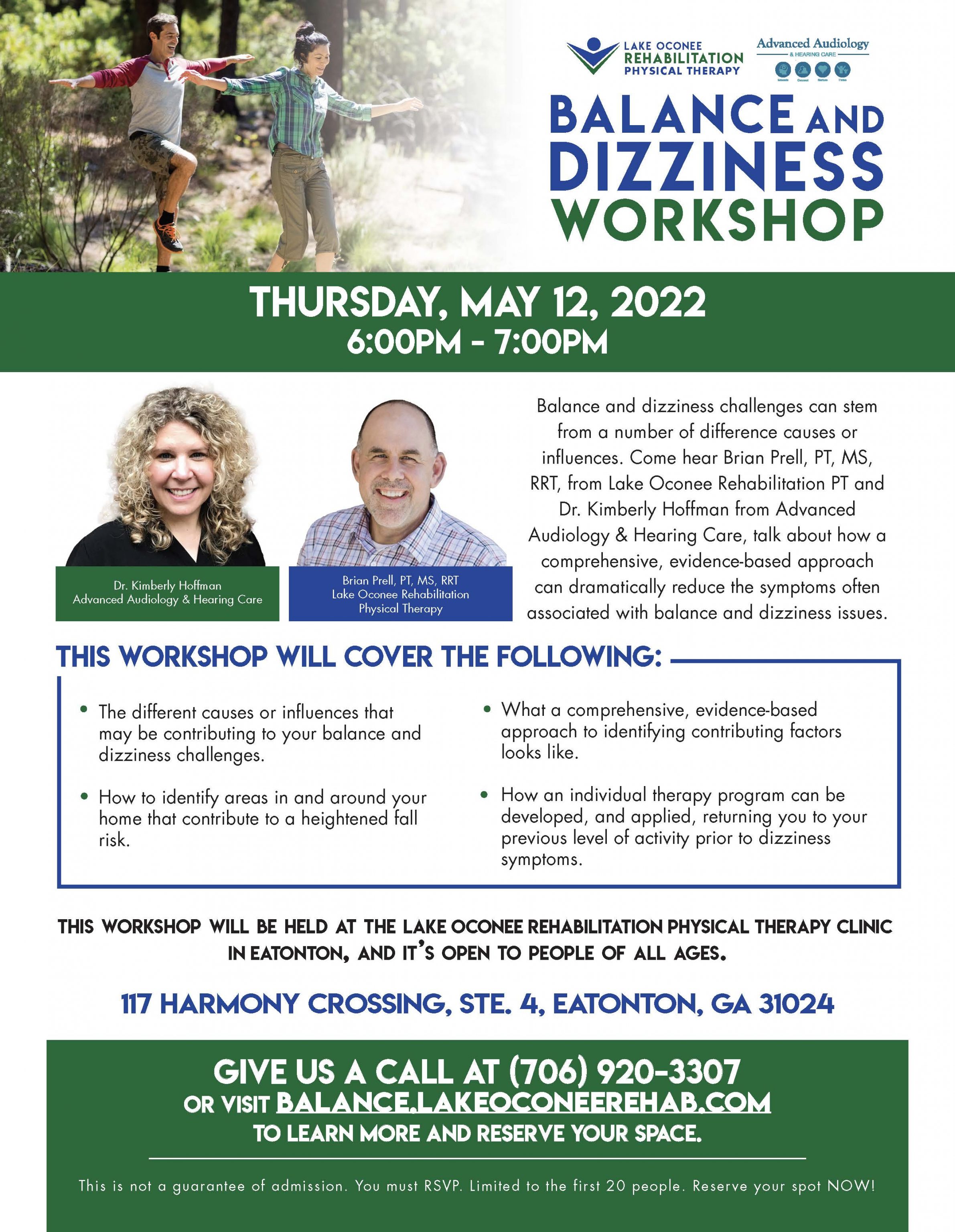 Join us for our Balance and Dizziness workshop on Thursday, May 12, 2022 from 6:00 pm to 7:00 pm. Balance and dizziness challenges can stem from a number of difference causes or influences. Come hear Brian Prell, PT, MS, RRT, from Lake Oconee Rehabilitation PT and Dr. Kimberly Hoffman from Advanced Audiology & Hearing Care, talk about how a comprehensive, evidence-based approach can dramatically reduce the symptoms often associated with balance and dizziness issues. Click here to register.